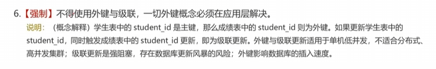 在以前學習數(shù)據(jù)相關知識的時候,有幸閱讀過阿里的數(shù)據(jù)庫開發(fā)規(guī)范手冊,里面提到一條強制等級的規(guī)范:不得使用外鍵與級聯(lián),一切外鍵概念必須在應用層解決。